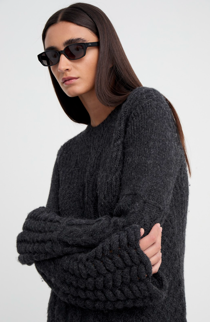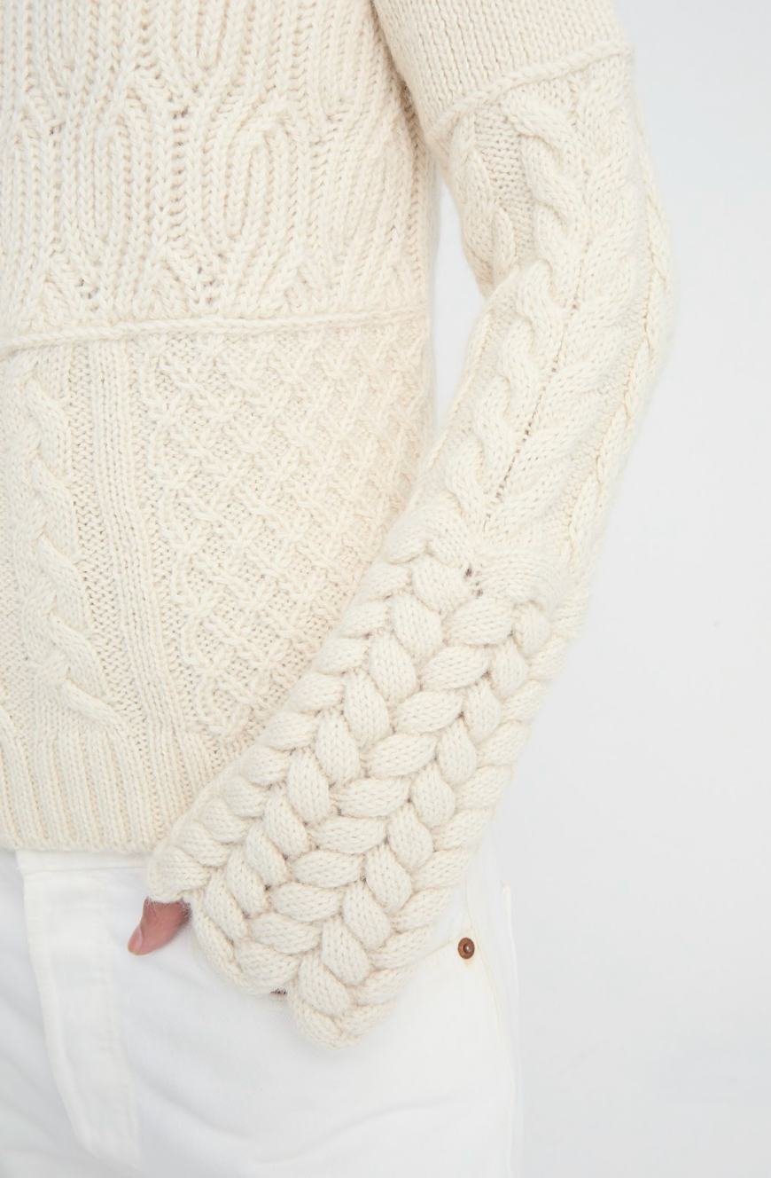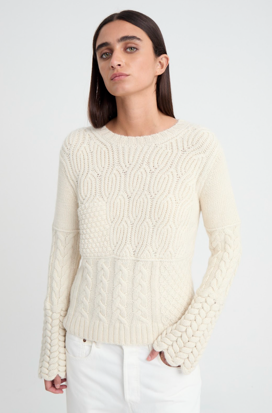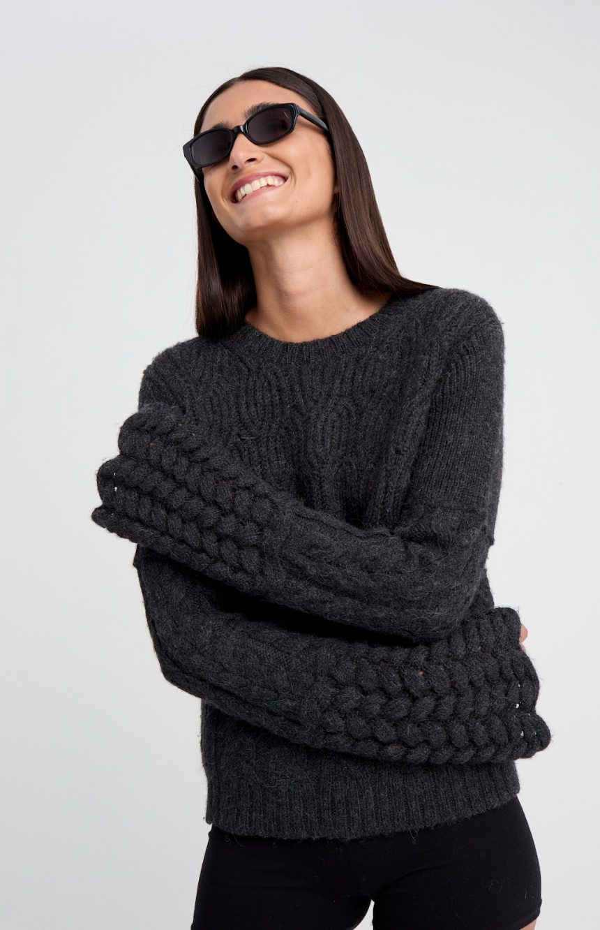 Sweater de baby alpaca. Cuello redondo, puntos diferenciados en mangas, frente y espalda. Detalles tejidos a mano. Calce recto