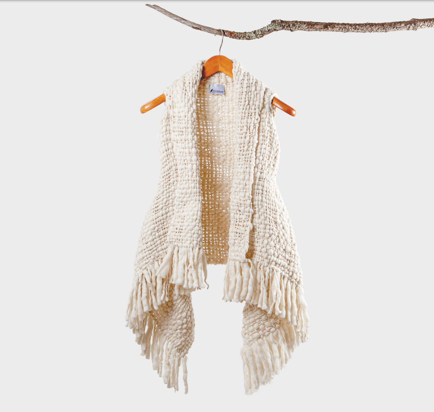 Suave y comfortable. Chaleco flamée con flecos en color natural. Talle único. Tejido artesanalmente en telar. 100% lana Merino especial, de alta calidad.