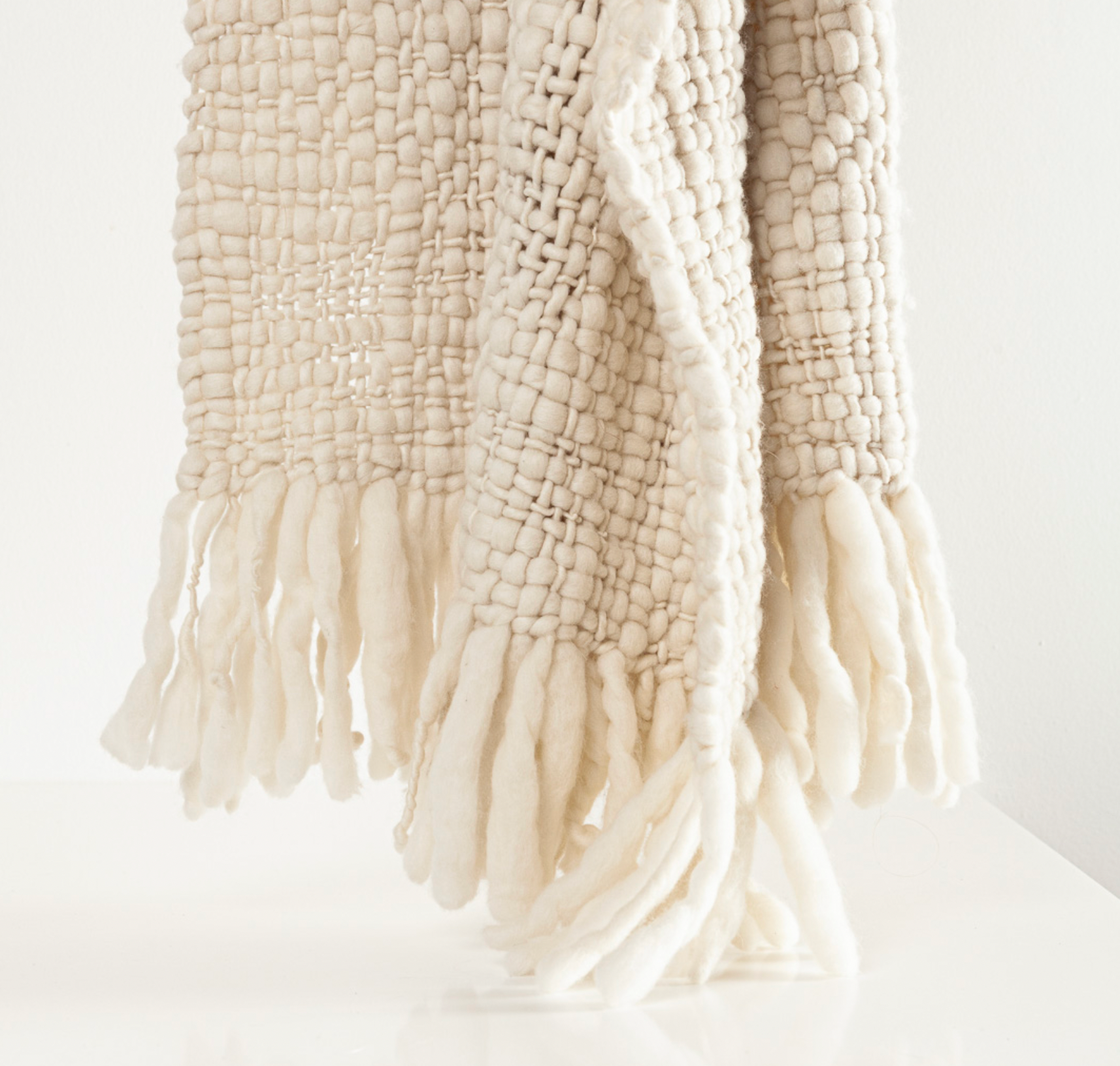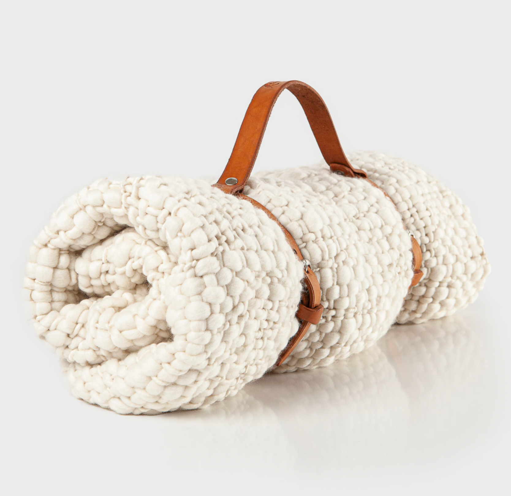 Pie de cama tejido en estilo flameé con arnés de cuero, ideal para decorar o llevar de paseo. 100% lana merino. Tejida manualmente en telar por artesanos.