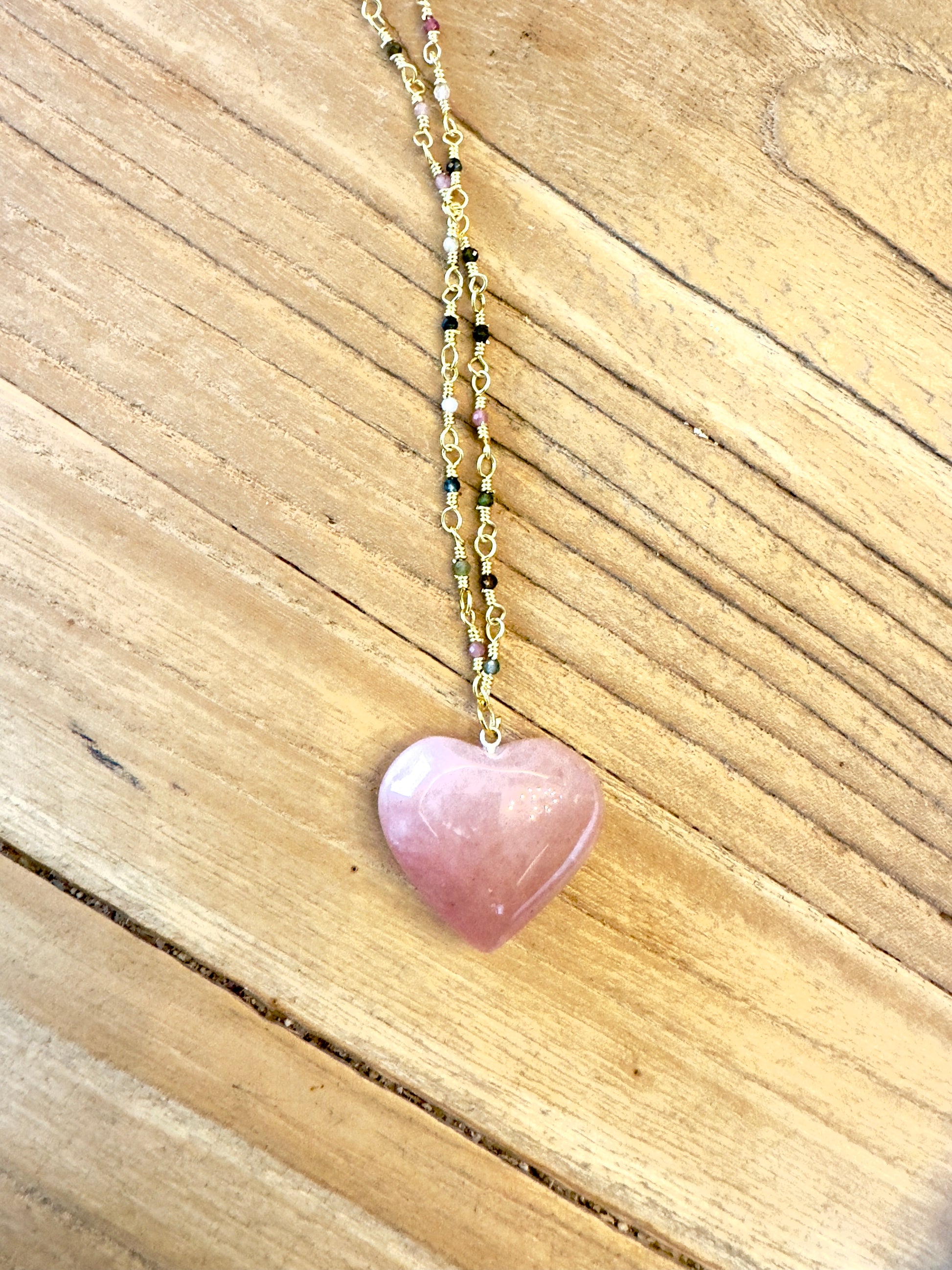 Collar con de piedras preciosas de turmalinas natural, hecha a mano y corazon de quarzo o corazon de banado en oro